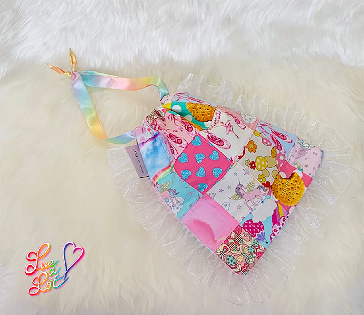 love a lot♡歴代コレクションのカラフルな布地を合わせた完全一点もの巾着ポーチです。