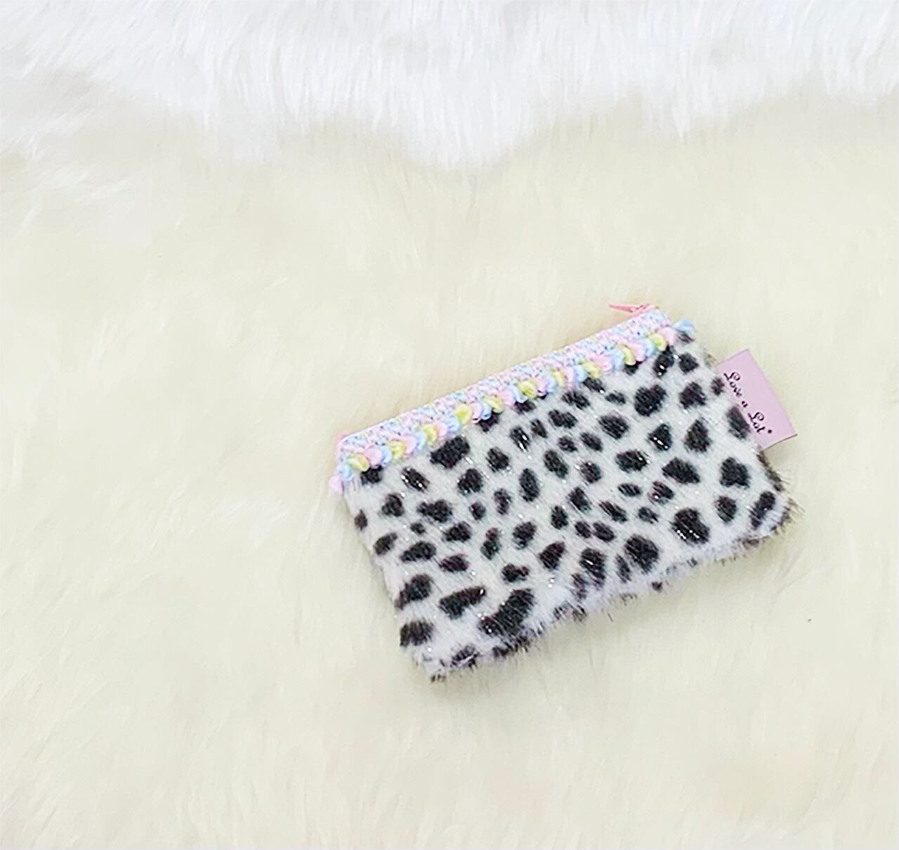 (ラメ入りダルメシアンファーポーチ)シリーズはひとつひとつ丁寧にハンドメイドで製作し、ひとつひとつ装飾品が違うので、世界にひとつだけ、オリジナルの一点ものです♪