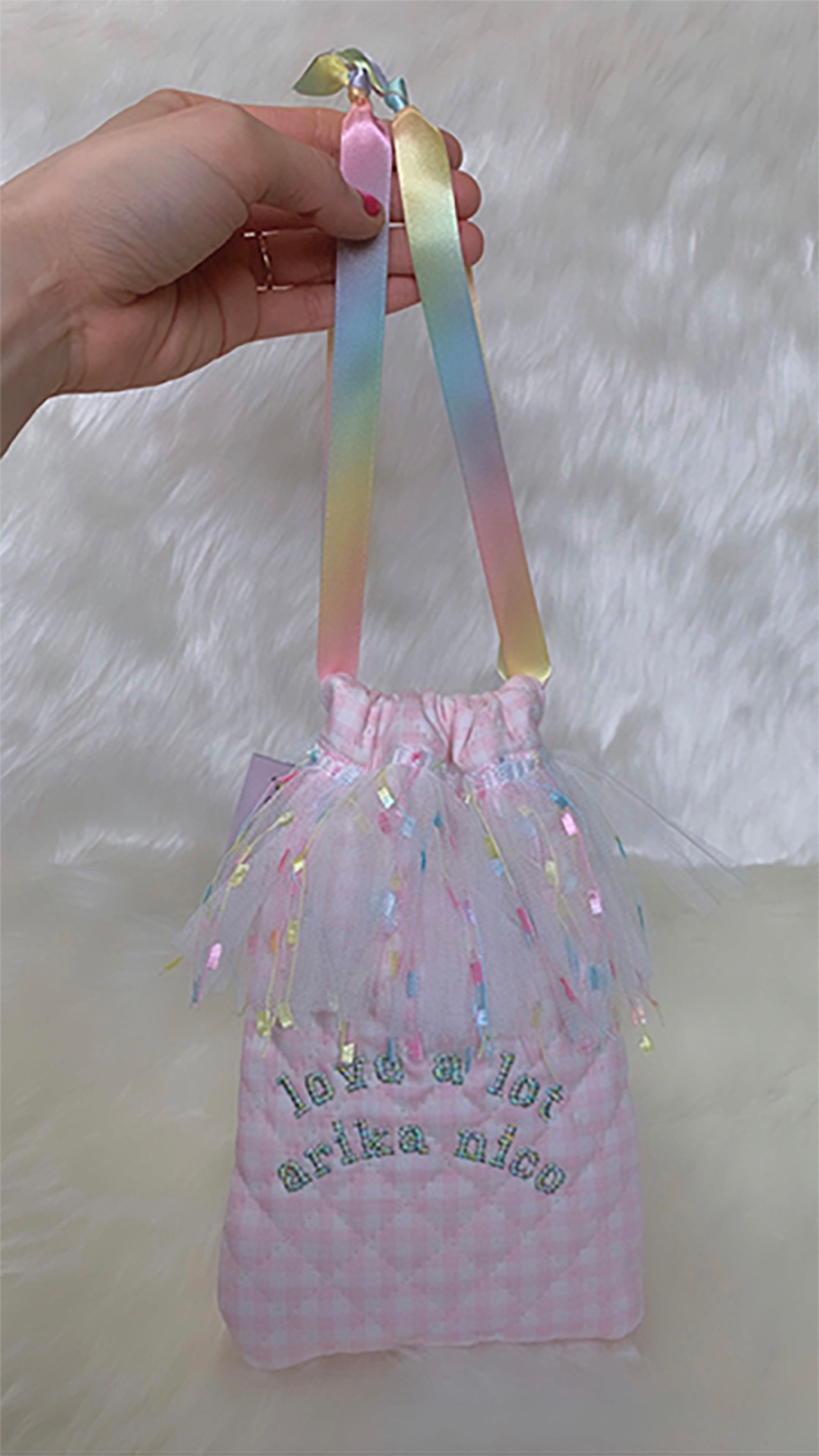 刺繍ロゴや手持ち部分のリボンも淡いギンガムチェックと相性のいいパステルカラーで統一。