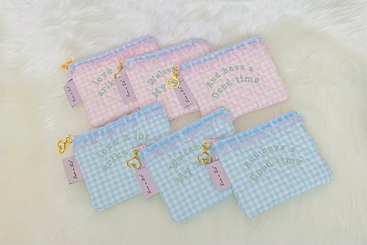 (ギンガムチェックのキーホルダーポーチ)シリーズはひとつひとつ丁寧にハンドメイドで製作し、ひとつひとつ装飾品が違うので、世界にひとつだけ、オリジナルの一点ものです♪